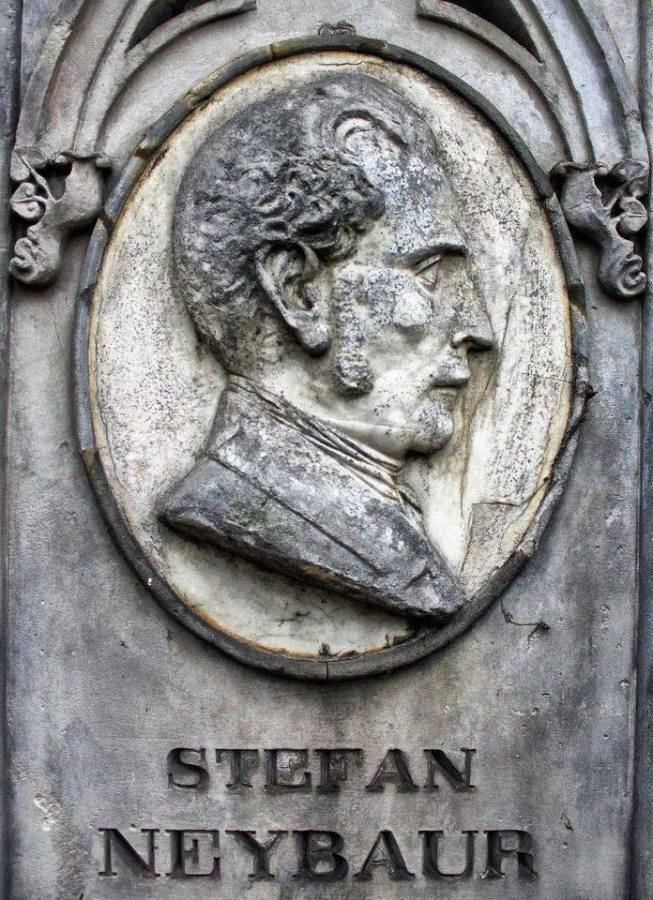 Nagrobek Stefana Neybaura, jubilera, męża Joanny, z domu Kazimirus, nazywanej Matką Sierot, wykonany przez Józefa Jana Manzla około roku 1864. Stare Powązki.